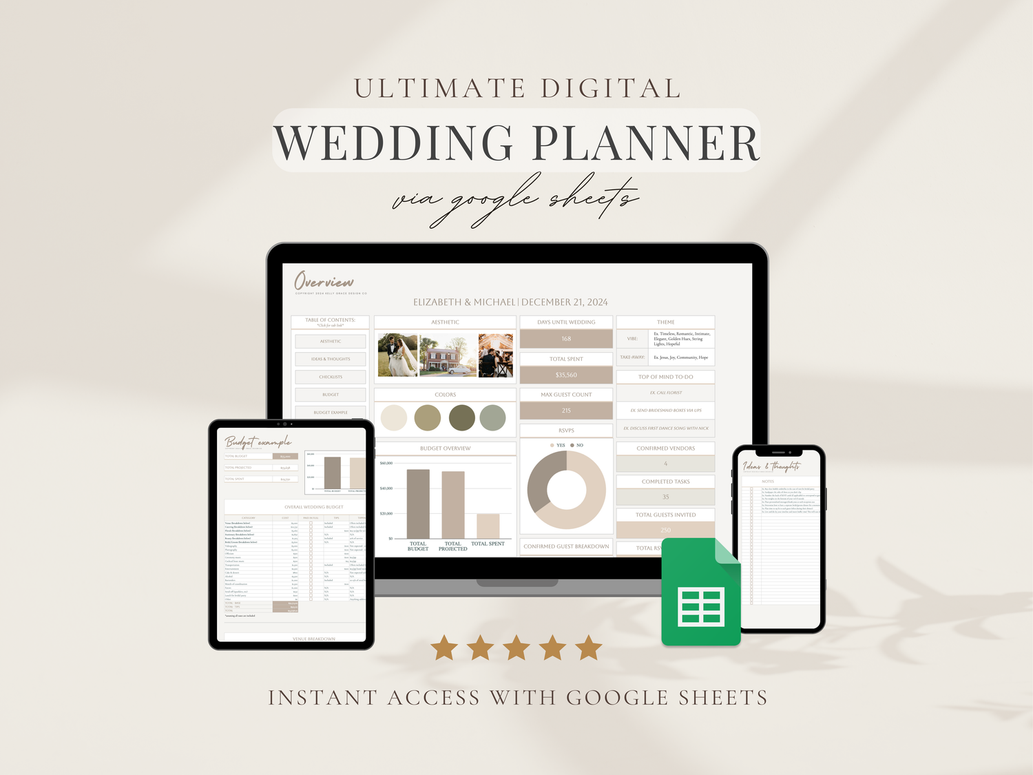 Transform your planning experience and become your own wedding planner with our powerhouse, comprehensive (20-tab) google spreadsheet.