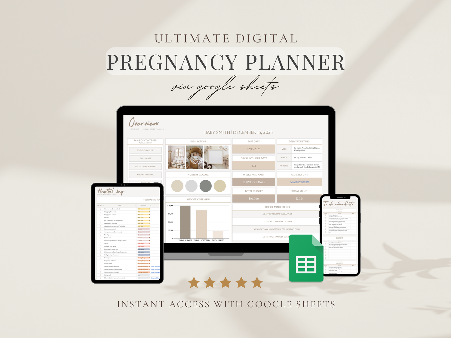 Stay organized and prepared with our comprehensive Pregnancy Planning Google Spreadsheet — featuring trimester checklists, nursery planning tools, a budget tracker, and more to guide you from the first positive test to delivery day.